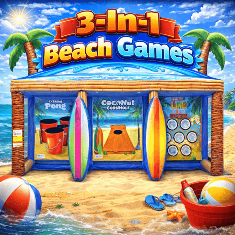 Beach Games 3 in 1 is a versatile rental that combines three exciting game experiences: Frisbee Pong, Coconut Cornhole & Put the Lime in the Coconut. Perfect for outdoor events, it's designed to bring the fun and energy of the beach to any gathering, whether you're playing competitive games or enjoying a casual day in the sun.