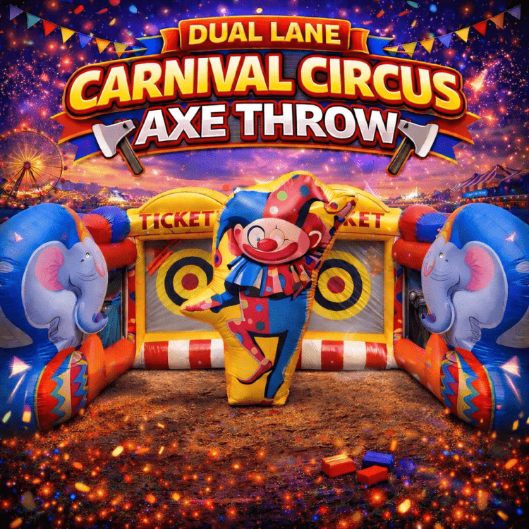 Unleash your inner carnival champion with our Carnival Circus Double Lane Axe Throw! This thrilling inflatable is a fantastic addition to any event, offering guests the unique and exciting opportunity to safely engage in axe-throwing fun. Designed with eye-catching carnival and circus themes, it's the perfect match for your bounce house setup, transforming your party into a spectacular event. Ideal for competitive spirits and fun-seekers of all ages, our Double Lane Axe Throw is a crowd-pleaser at birthday parties, corporate events, and community gatherings. Rent now and add a dash of carnival excitement to your next event!