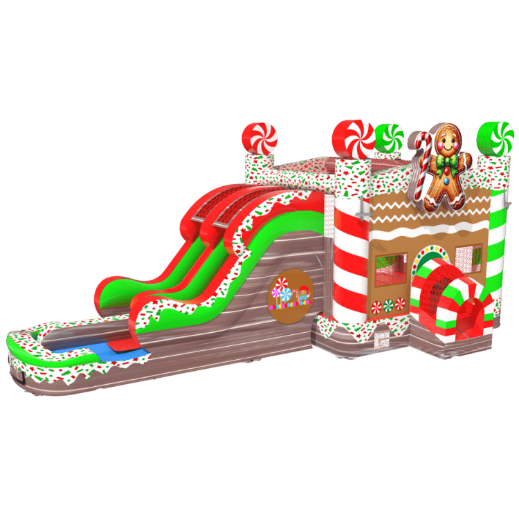 A festive Peppermint Twist Double Lane Combo brings holiday magic to any party with a cheerful gingerbread-and-candy theme, two side-by-side slides for simultaneous racing, and a roomy bounce area to jump and play. Kids enter through a candy-cane arch into the colorful bounce house, then choose either lane of the wavy dual slide that ends in a shallow splash or landing padโperfect for fast-paced fun and easy supervision. Bright peppermint swirls, gumdrop accents, and a smiling gingerbread figure give it a playful seasonal look that delights younger children while keeping safety features like high sidewalls and netted windows for visibility. Ideal for Christmas events, winter fundraisers, or any candy-themed celebration where you want twice the sliding action and nonstop bouncing excitement.