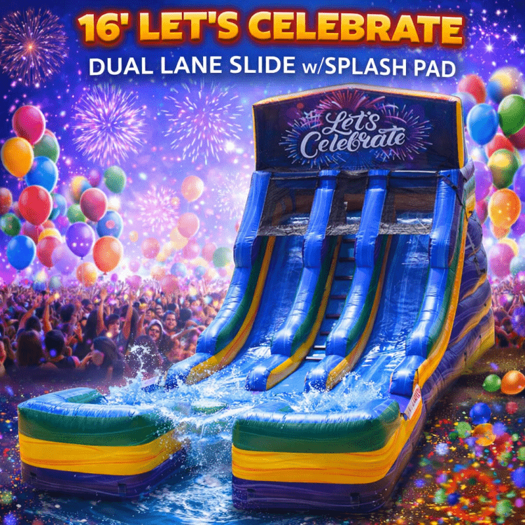 Get ready for double the fun with the "Let's Celebrate 16ft Double Lane" inflatable! Perfect for kids 14 and under, this water slide (can be used dry) features two exciting lanes that let friends race, slide, and bounce to their hearts' content. At 16 feet tall, it offers plenty of space for joy and laughter, making any party or event a memorable blast.